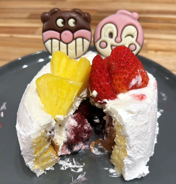 ロールケーキを2つ重ねて、周りにホイップクリームを塗って、ケーキを作ってくれていました。